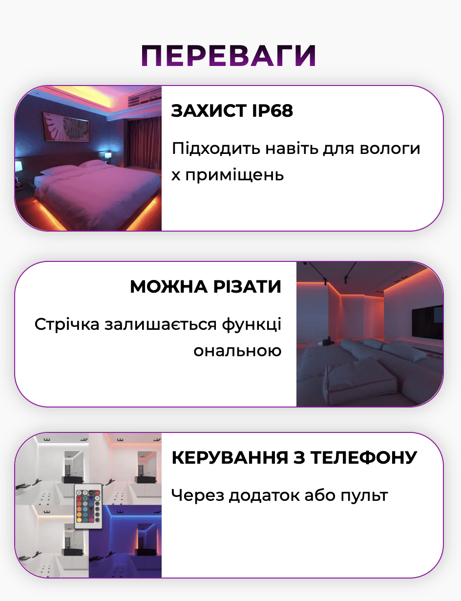 Обирайте з десятків кольорів та режимів світіння — динамічні переливи, спокійне сяйво чи святкові ефекти. Керуйте стрічкою за допомогою смартфона, пульта або кнопки на контролері.