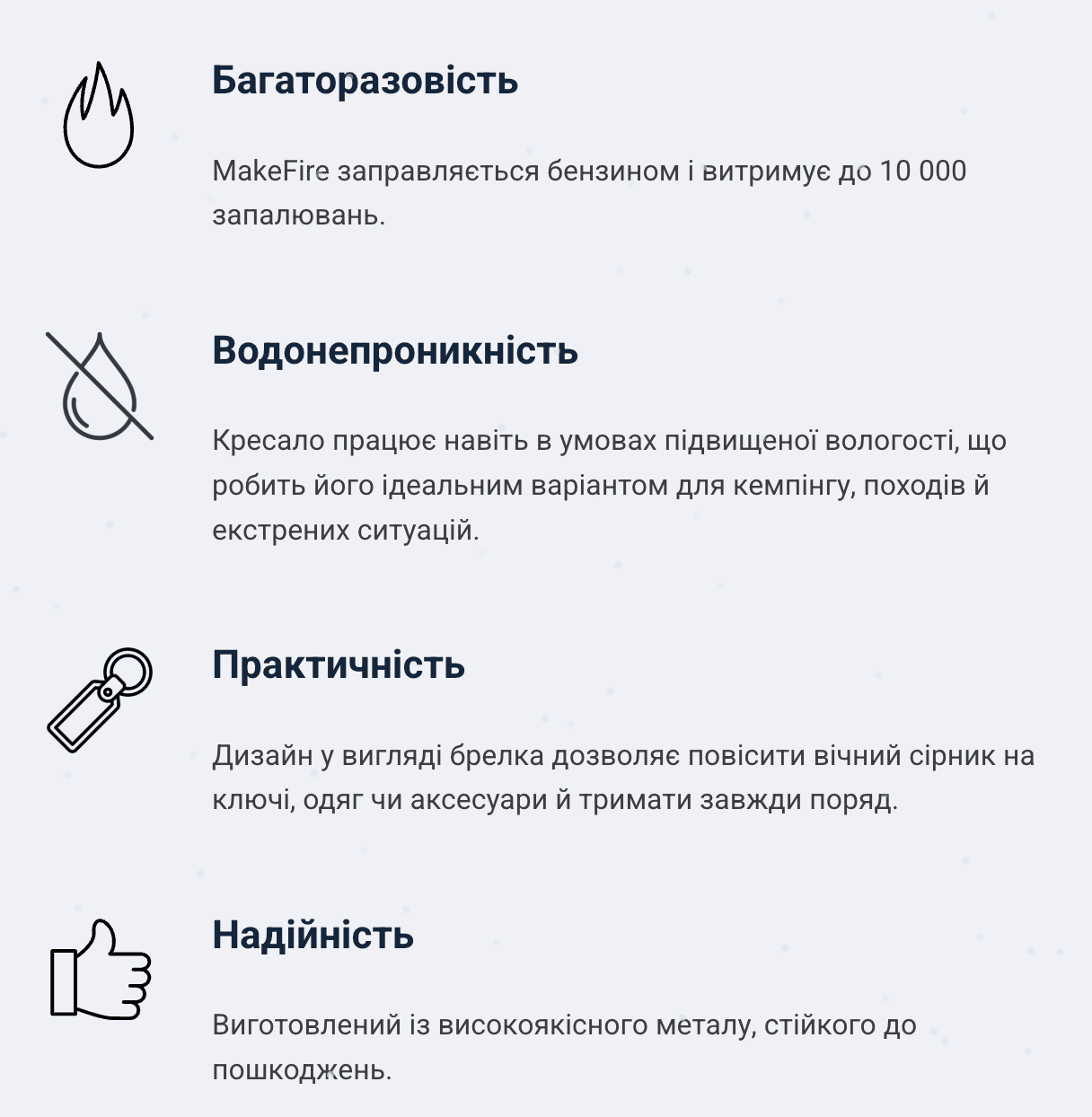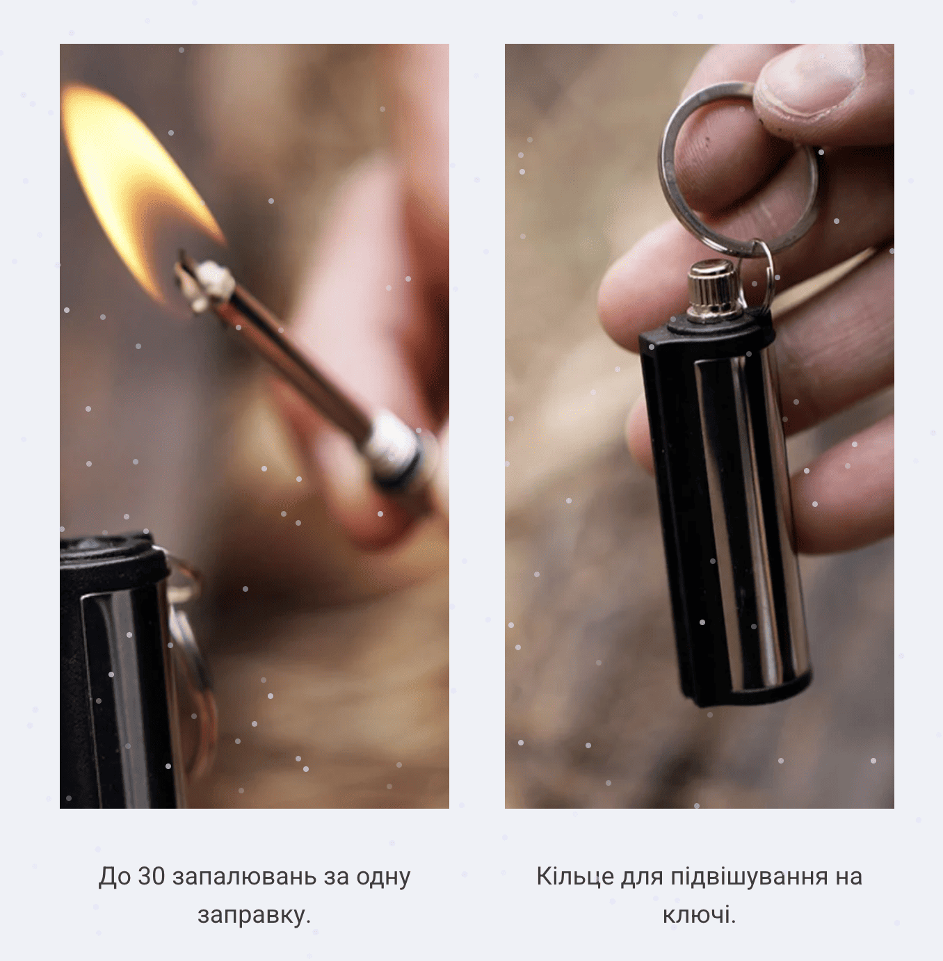 MakeFire — це бензинова запальничка для розведення вогню за будь-яких умов. Металевий сірник не боїться вологи та завжди готовий до роботи, а циліндричний корпус оснащений брелком, щоб тримати MakeFire завжди поряд.