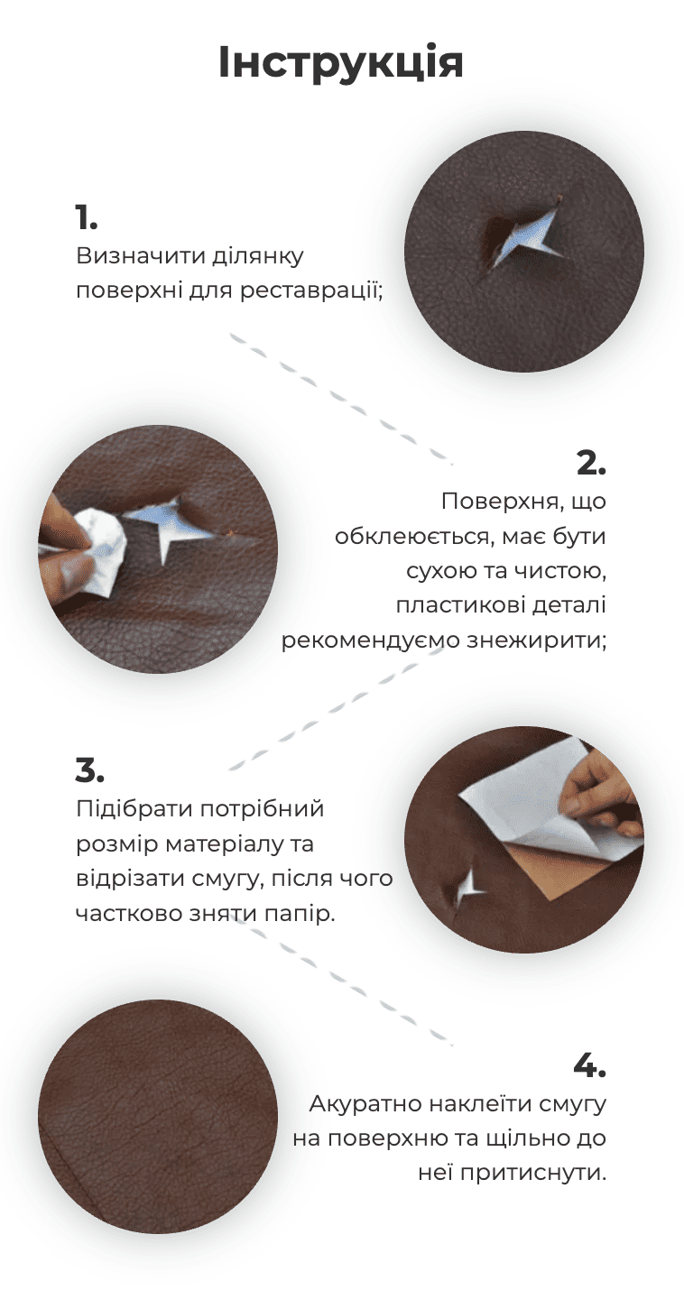 Самоклейна екошкіра у рулоні легко та швидко допоможе усунути усі проблеми з виробами із натуральної шкіри або її аналогів. Самостійно можна відреставрувати меблі чи салон автівки. Матеріал може використовуватися як у вигляді фігурних латок, так і довгими смугами для усунення досить великої площі дефектів.