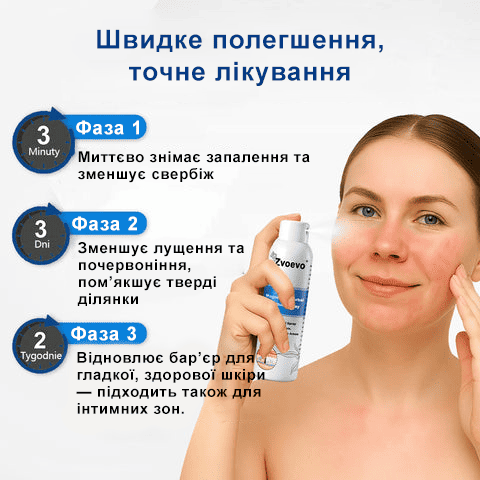 Zvoevo® допомагає регулювати надмірне розмноження клітин шкіри, зменшує почервоніння, лущення та печіння, а також сприяє відновленню природного захисного бар’єра — повертаючи шкірі здоровий вигляд і природний баланс.